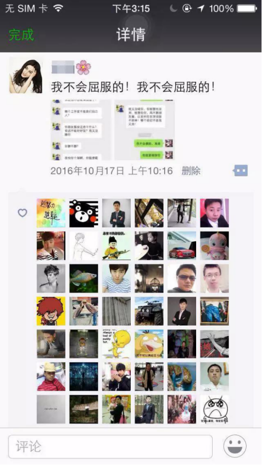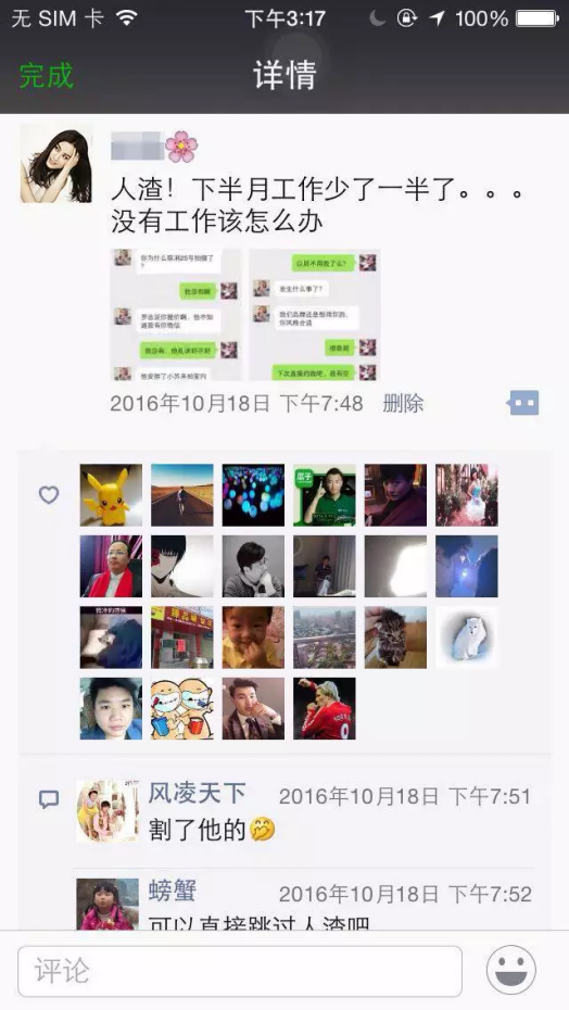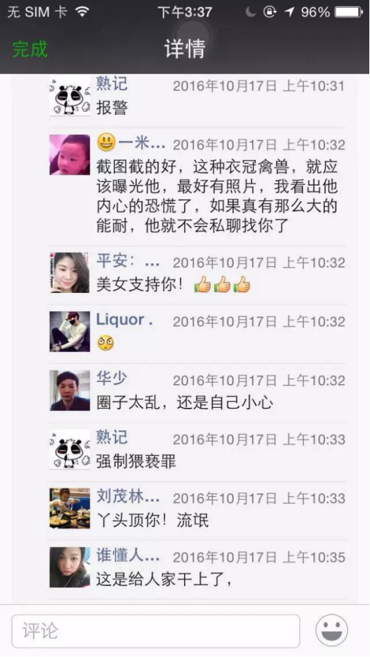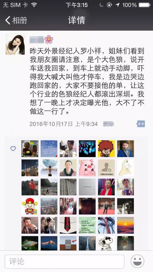 2、20天后,劇情轉折,發圈表示經濟人欲潛規則自己,現已走投無路。此時,一定會激起粉絲的憤怒、同情與共鳴。可自行扮演經紀人,制作如下截圖,使得事件真實可信。點擊即可顯示完整高清大圖。